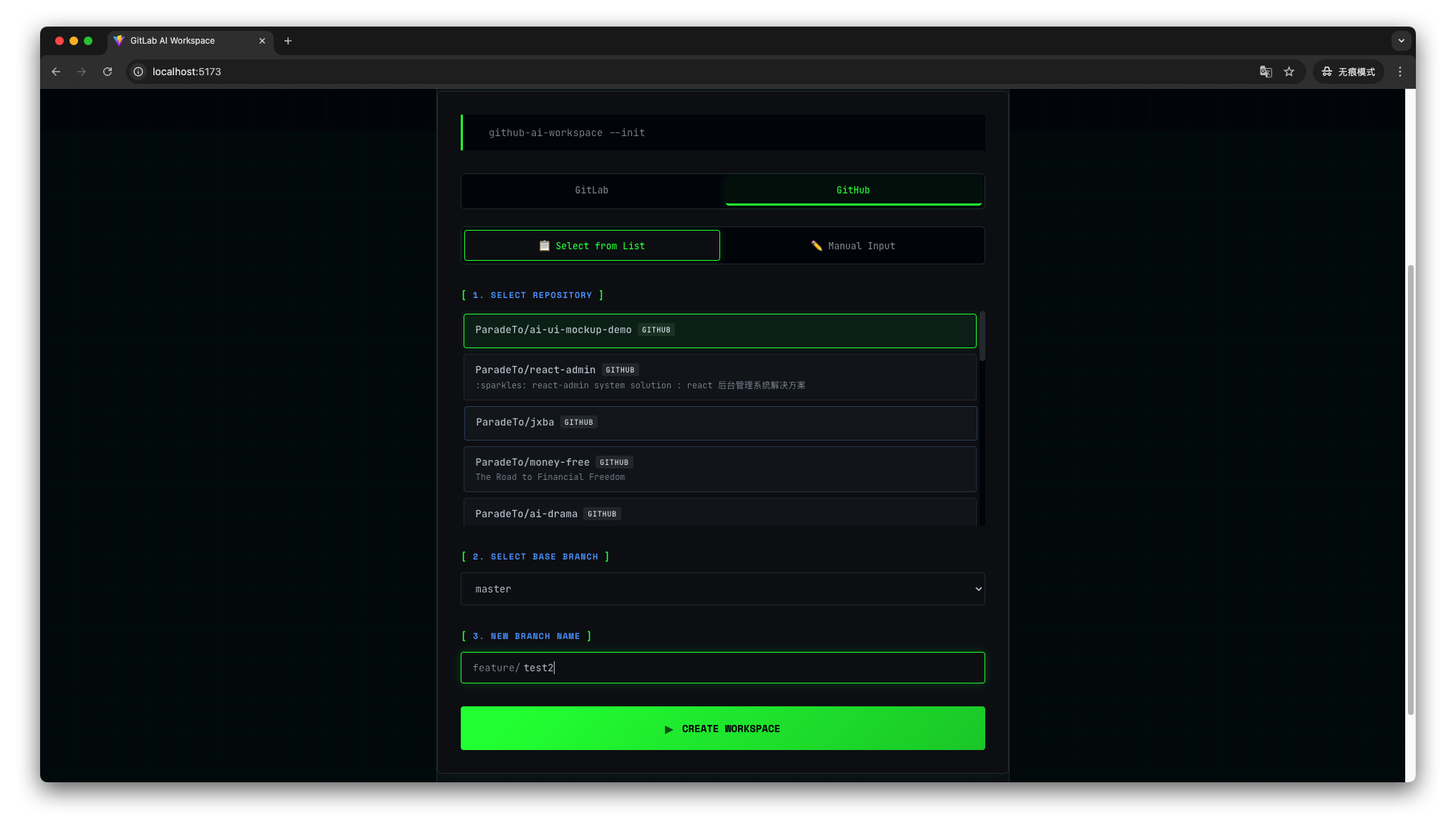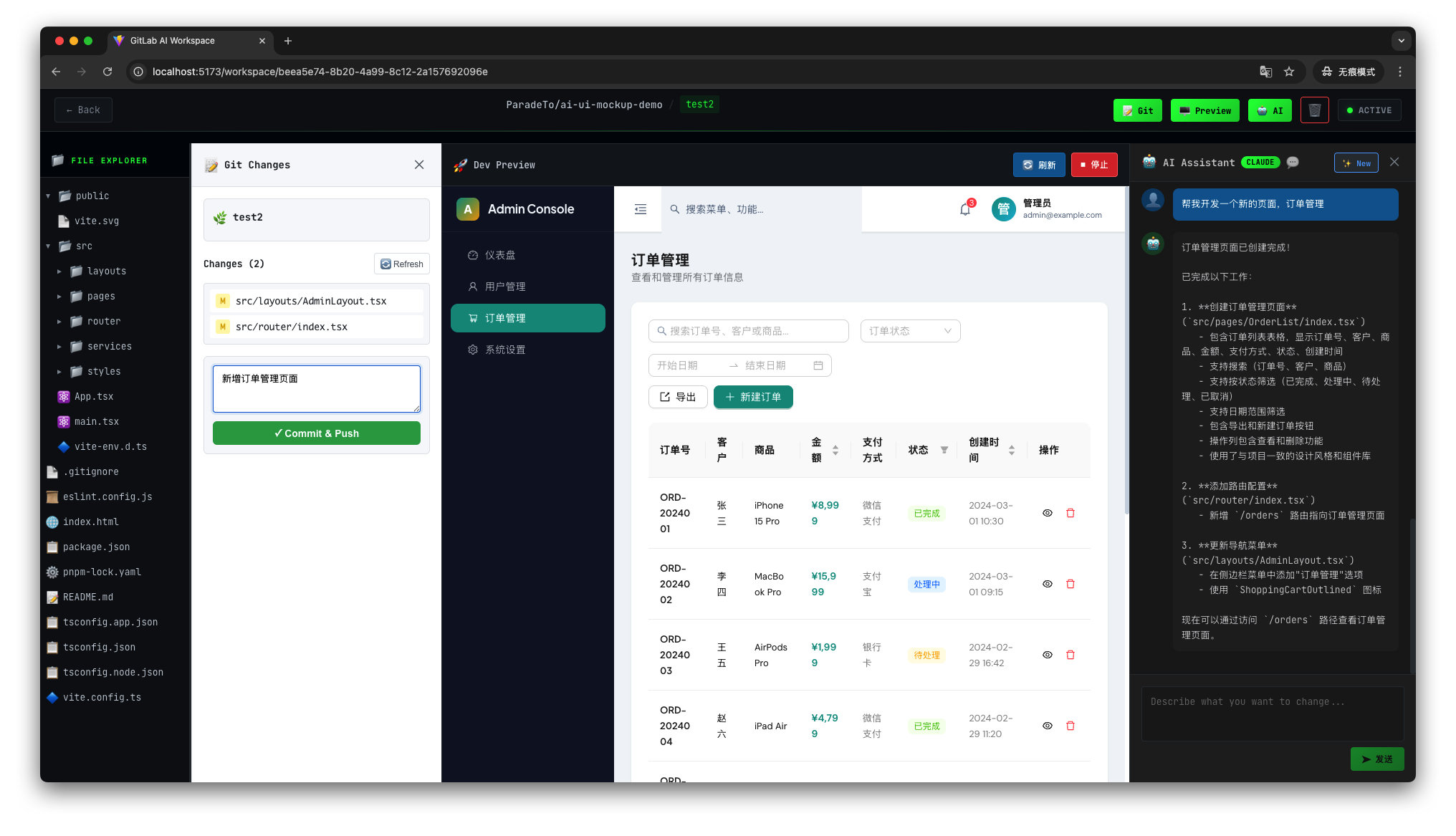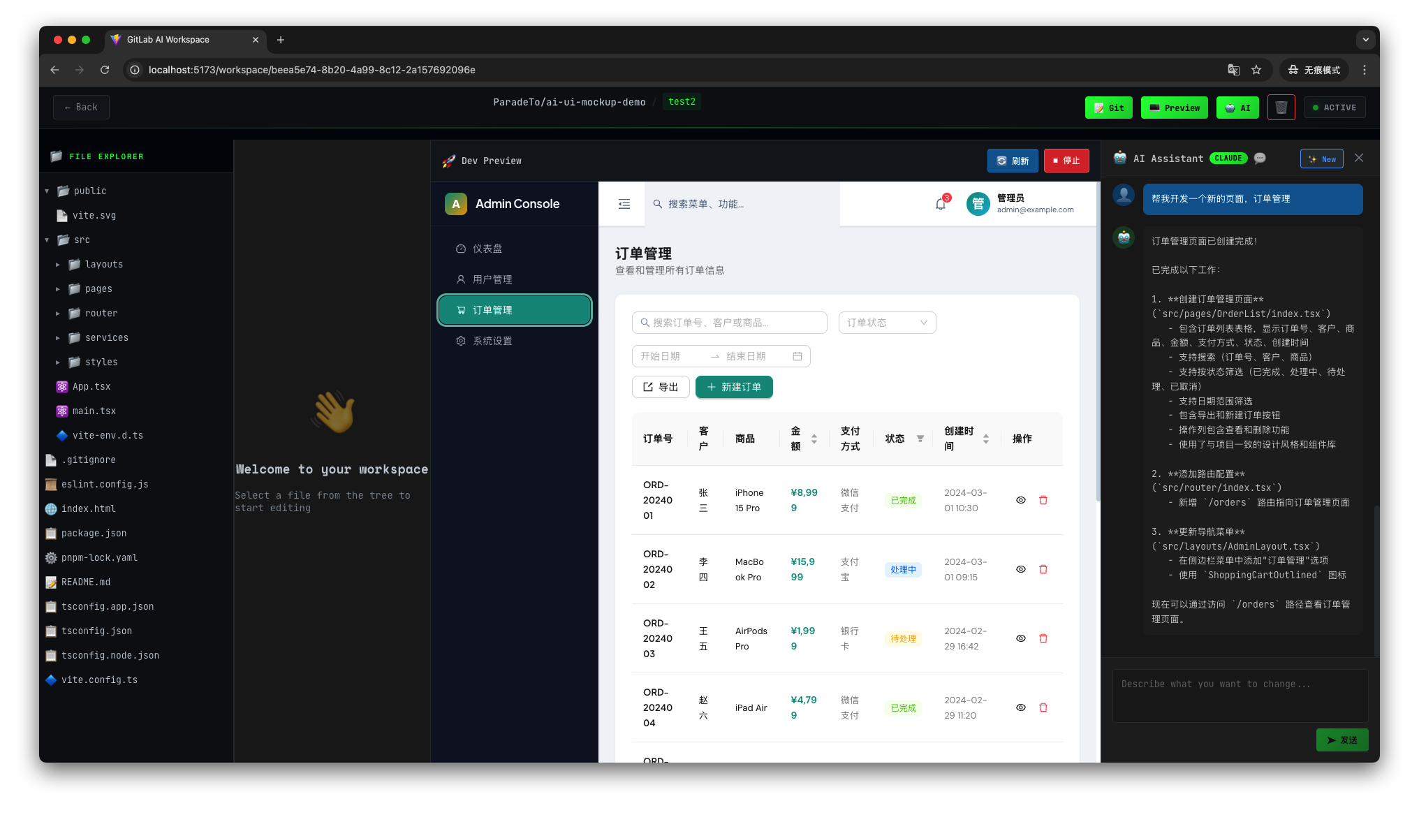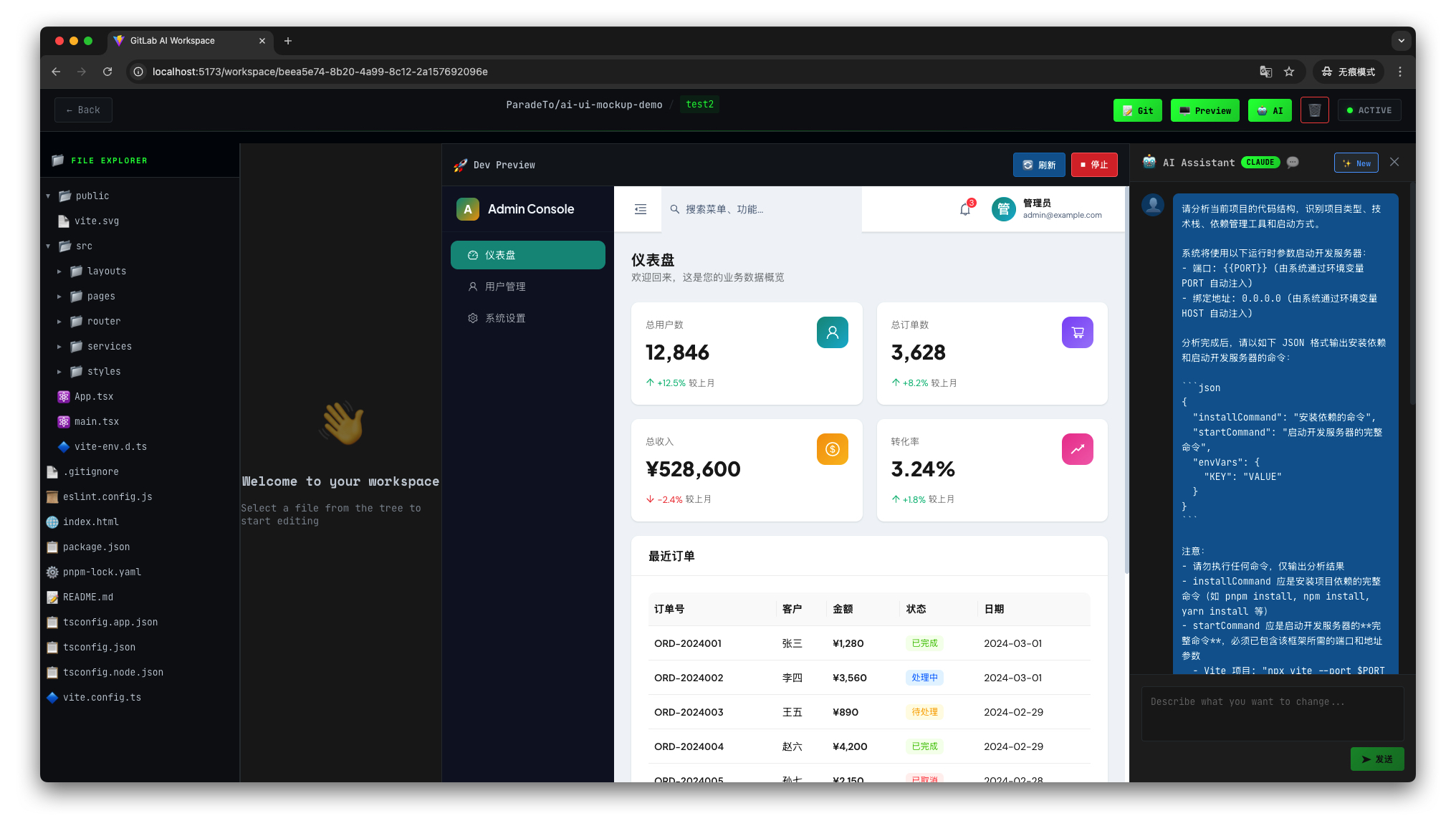 - 进入 workspace 详情页,可以查看仓库代码并使用 AI 来辅助启动项目的开发环境进行预览: