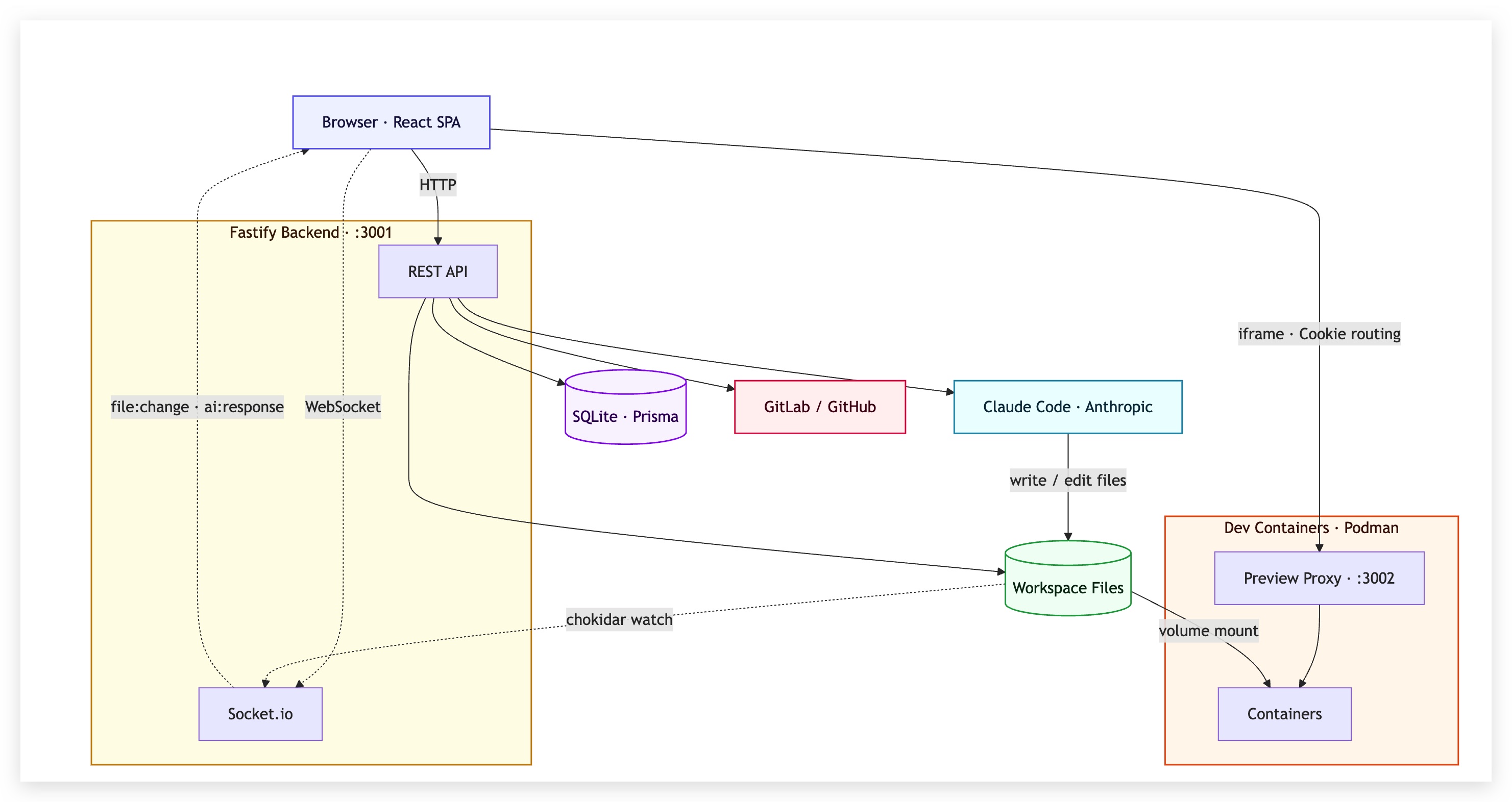 首先这是一个前后端分析的系统,后端有两个服务 3001 和 3002。其中,3001 主要负责提供 API 接口。3002 负责 proxy,因为同一时间会启动多个 workspace 的开发环境,这里采用了基于 cookie 的方式来实现流量分发,即前端发起 preview 请求时用 workspace ID 作为 cookie,后端 3002 请求根据 ID 去数据库中查询得到对应的端口号,将请求代理到目标服务。