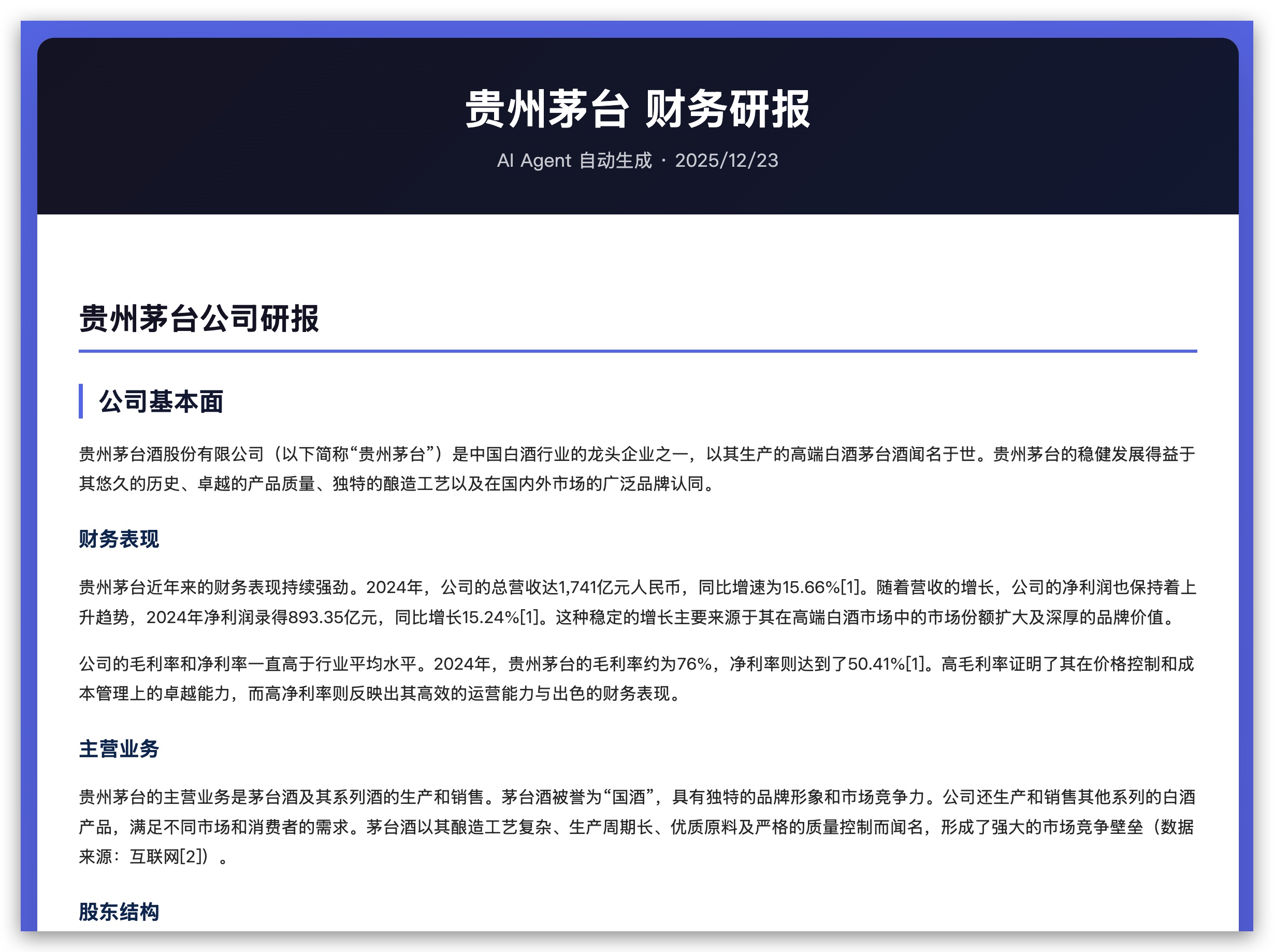 | 6 | generate_report | 生成报告 | 递归生成深度研报 HTML |
