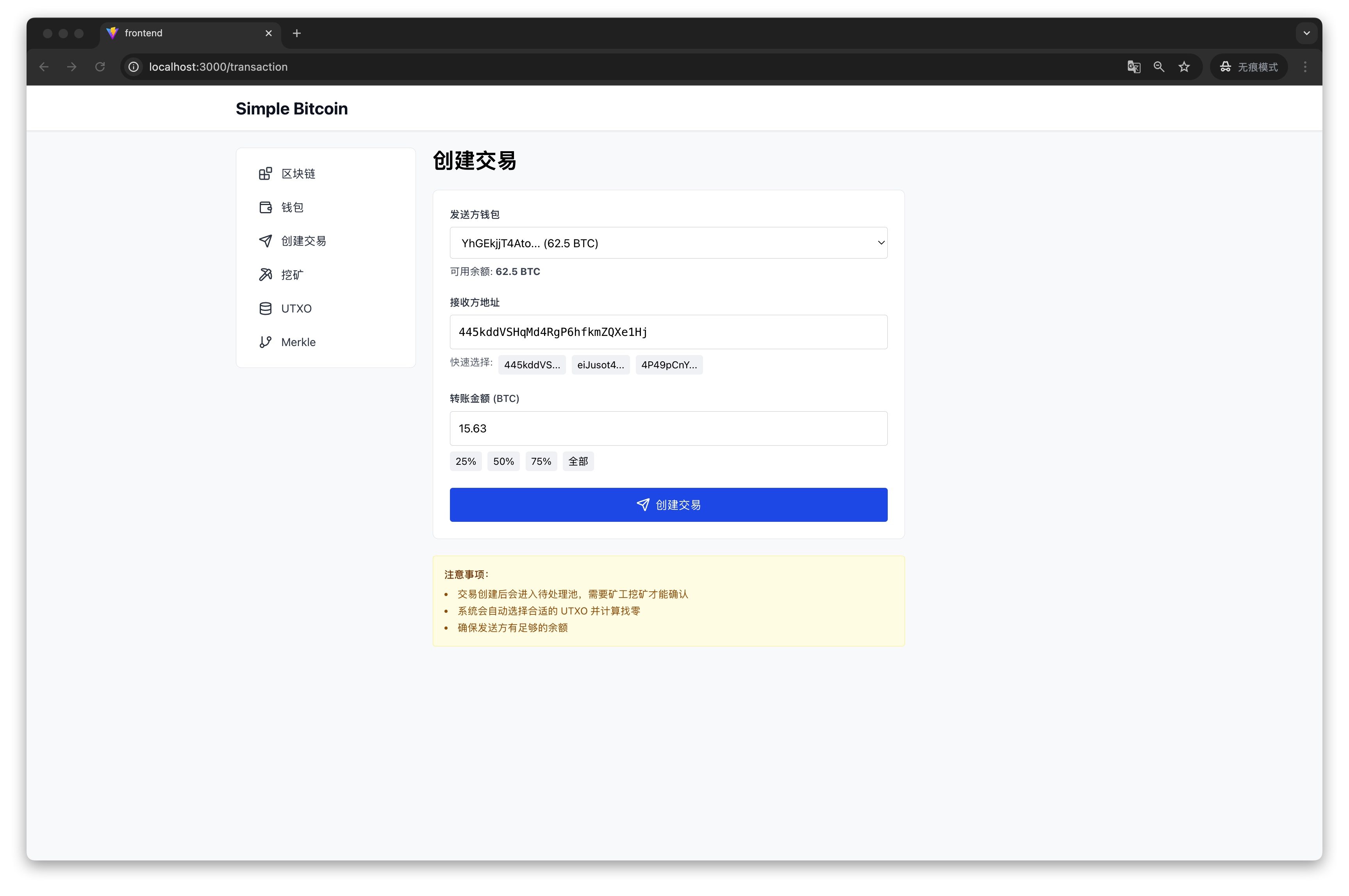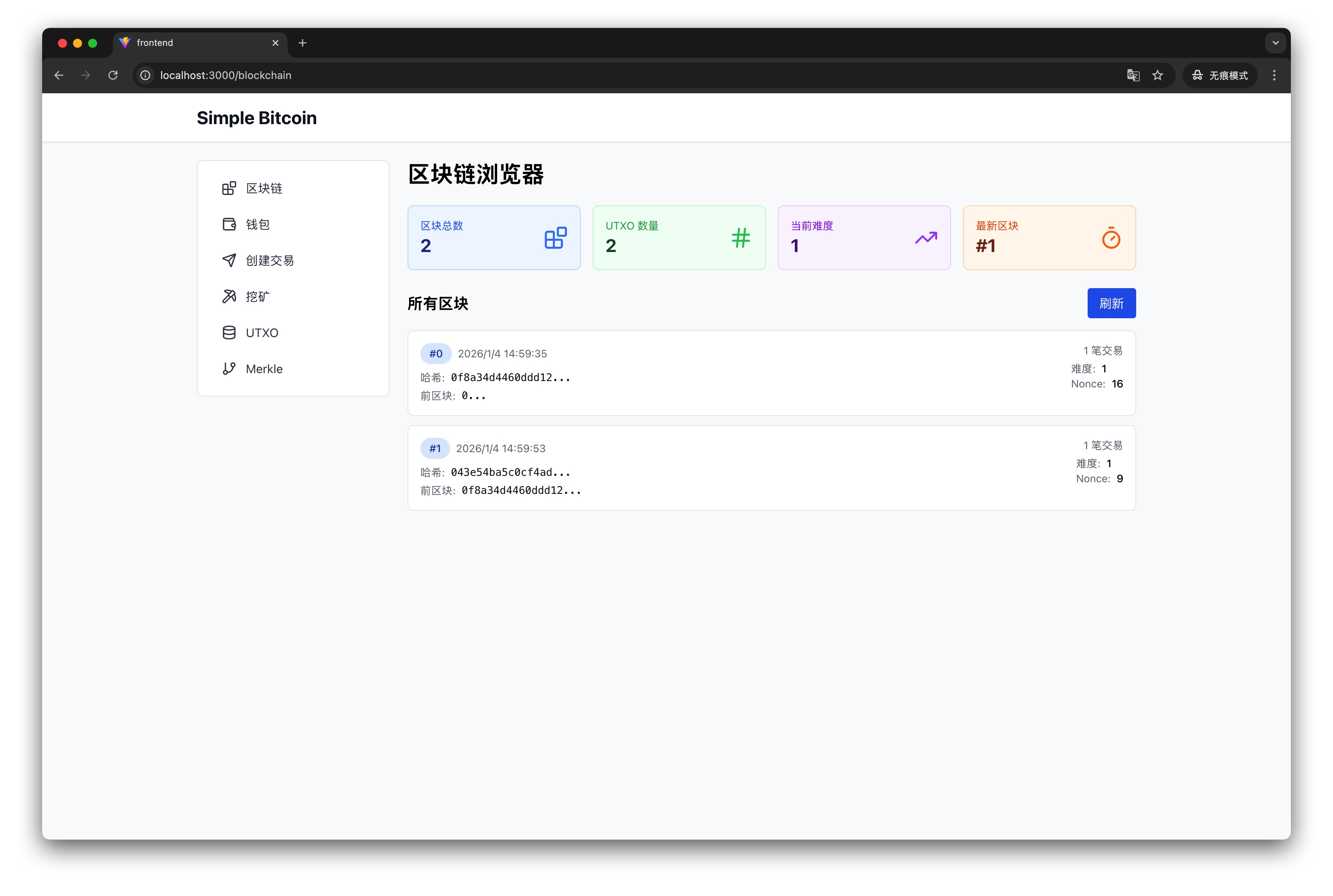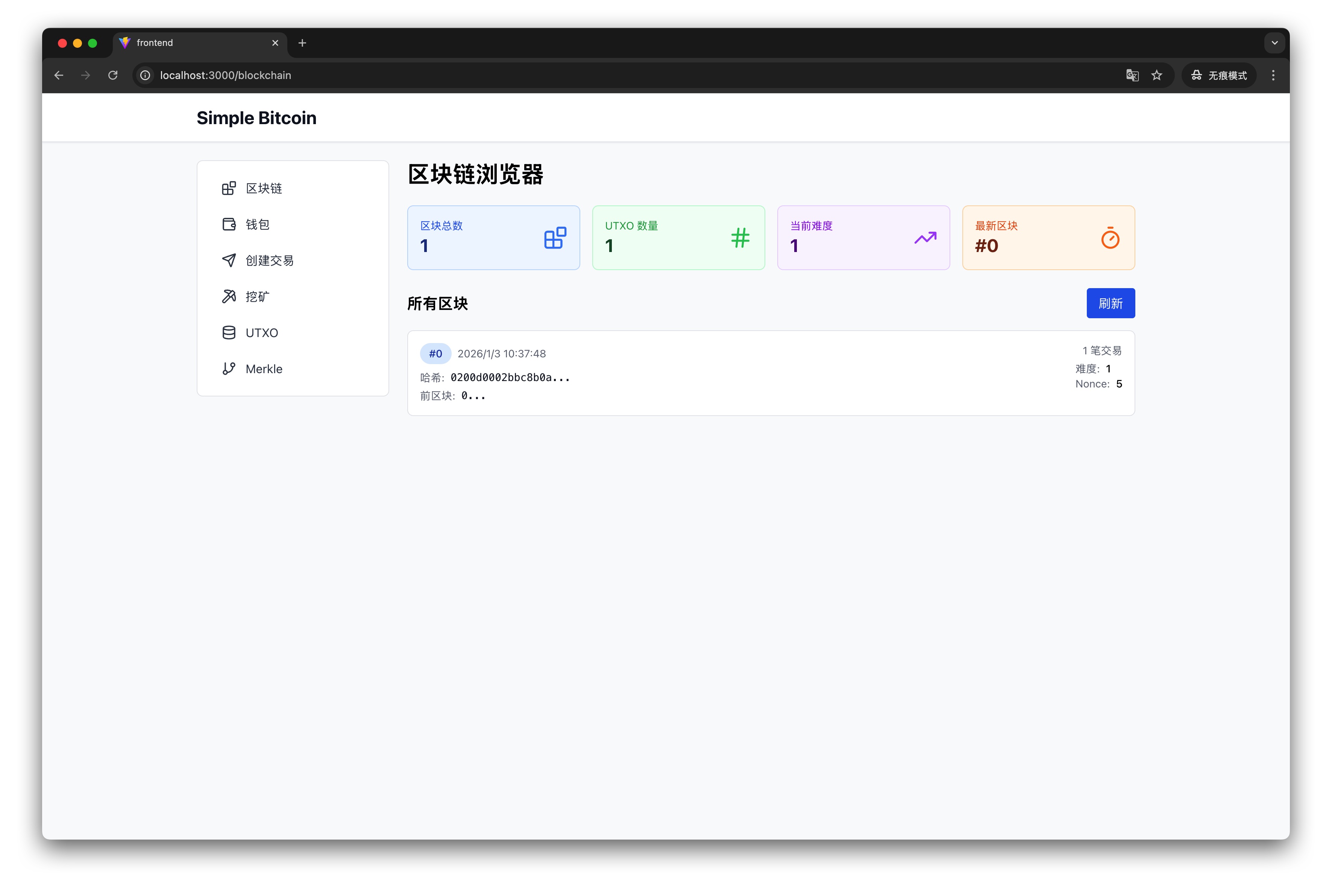 - 统计卡片:区块总数、UTXO 数量、当前挖矿难度、最新区块高度