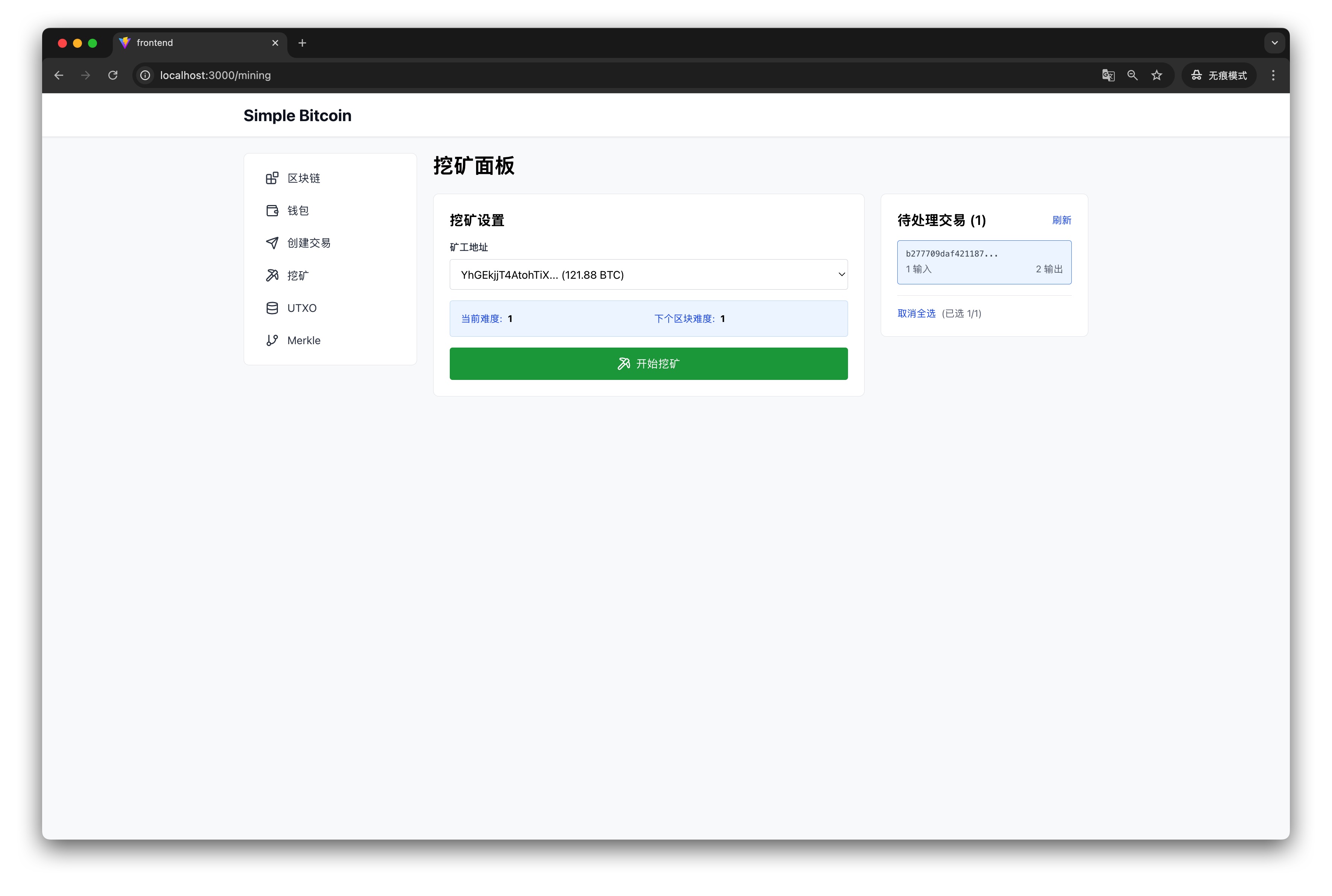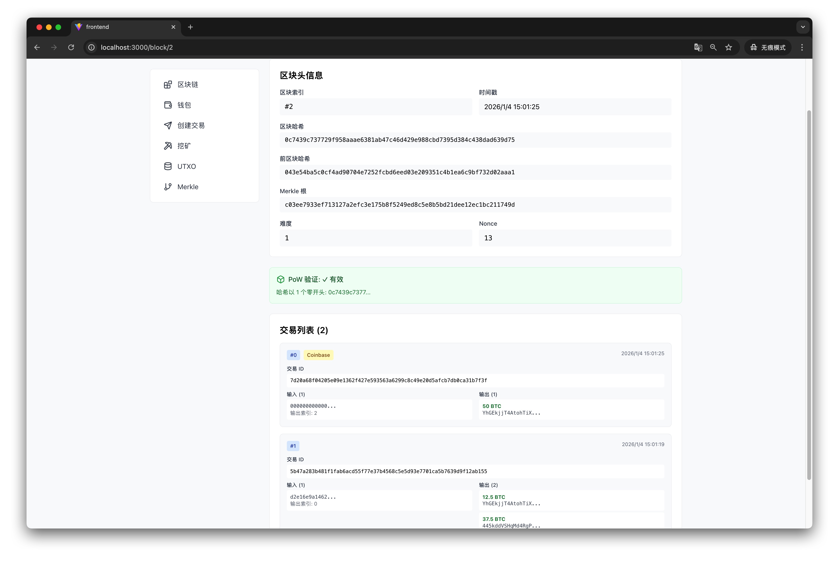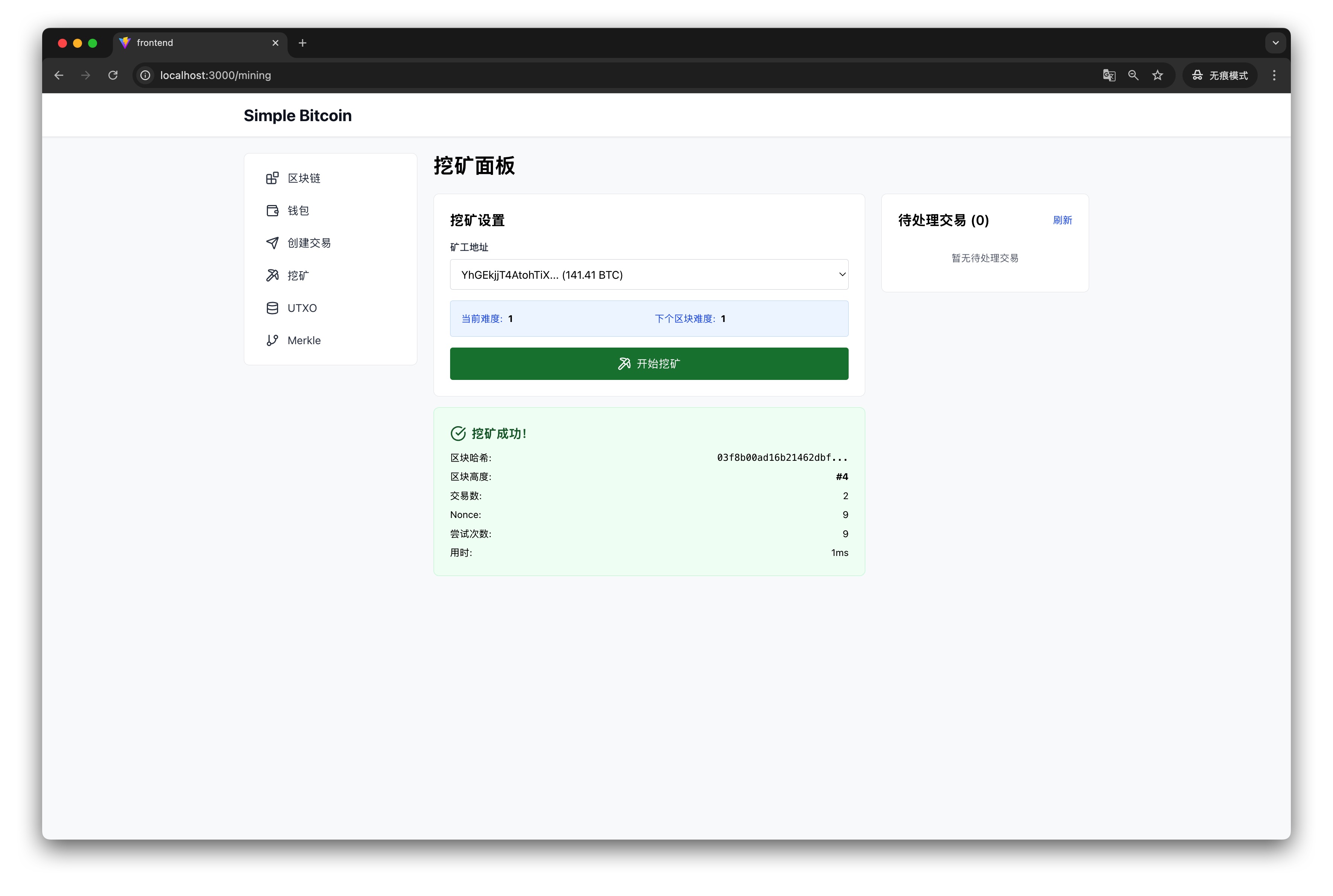 - 开始挖矿:点击后系统会执行工作量证明,找到合适的 Nonce